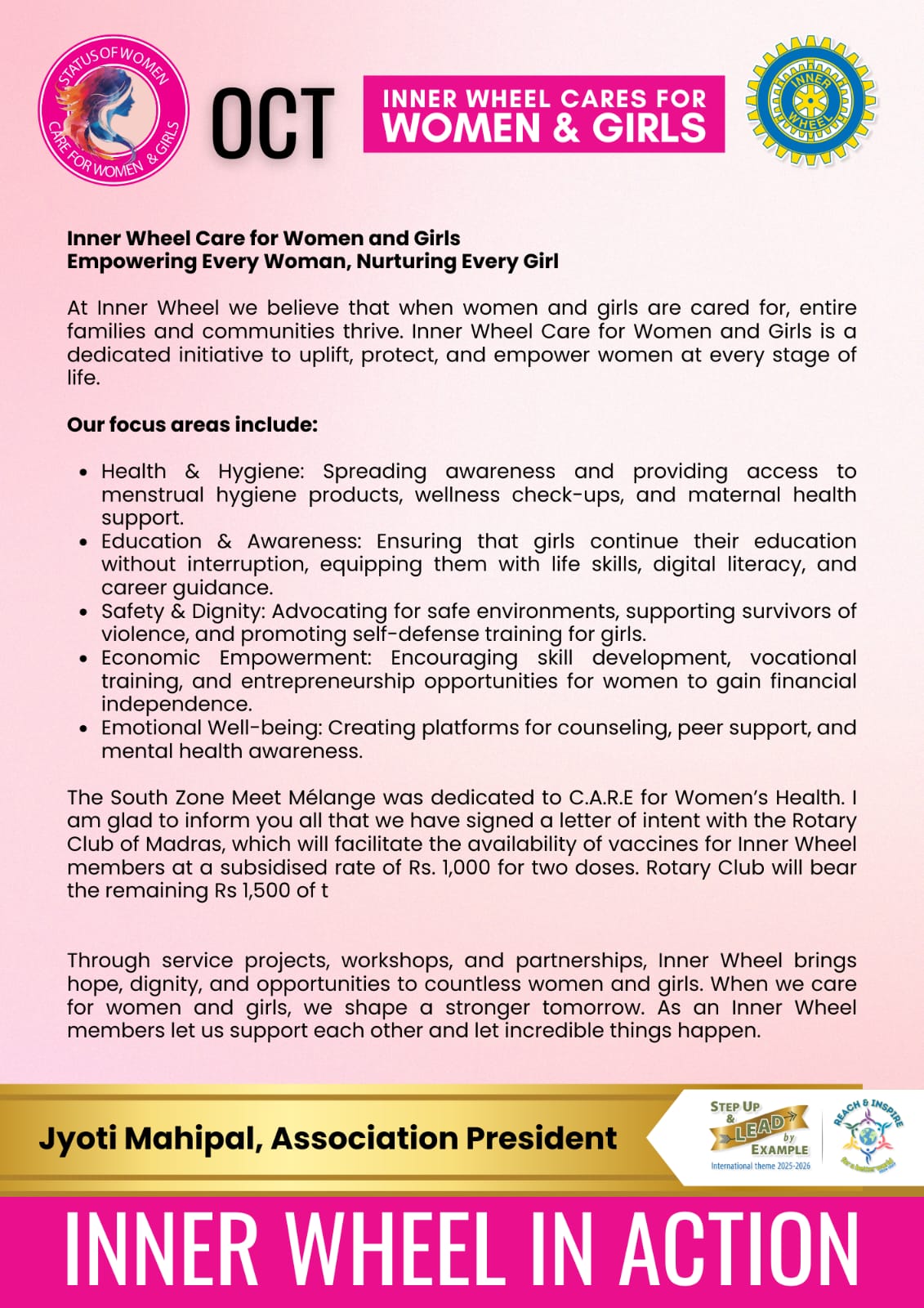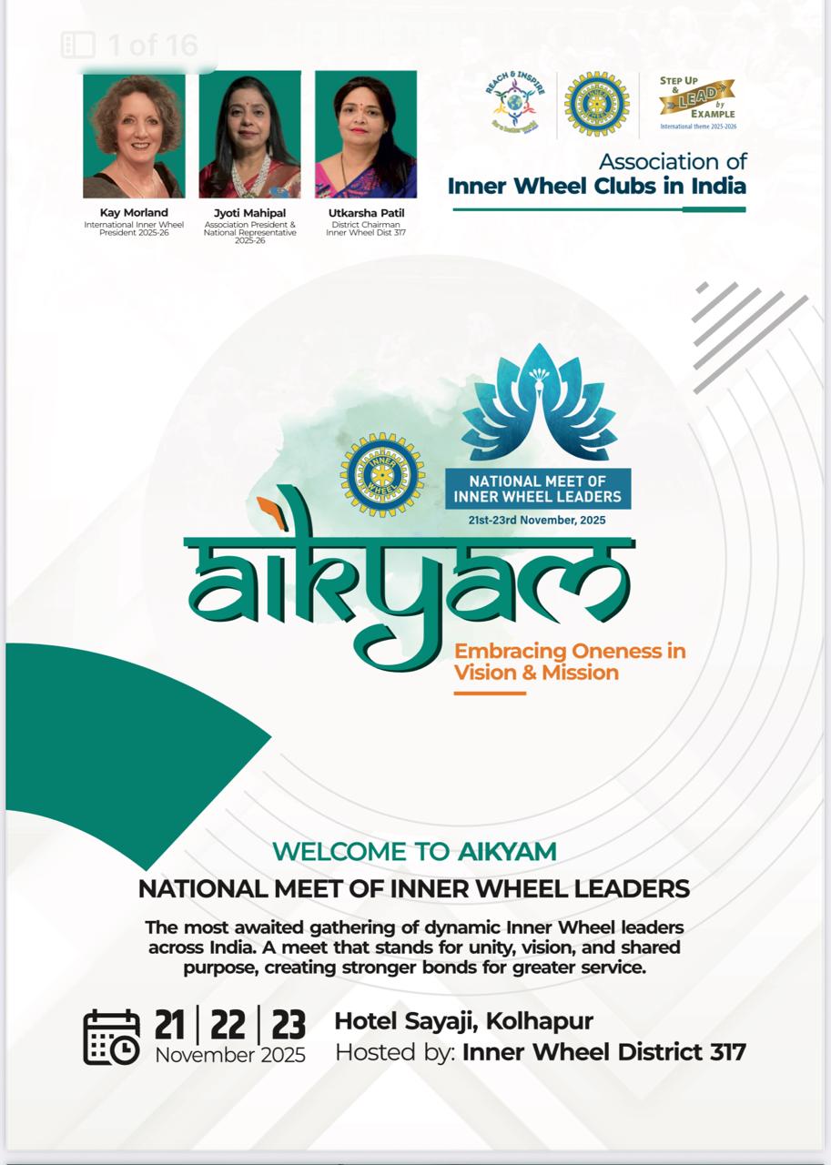 As the sun rises on 1st July, we turn a fresh page—one that awaits our ink of purpose, passion, and perseverance. Standing on the threshold of a new Inner Wheel year 2025–26, filled with promise and possibilities, it is my pleasure to extend my warmest greetings to each and every one of Inner Wheel members across the world. I embrace my role as the 50th Association President of the Association of Inner Wheel Clubs in India with humility and honour. This golden moment marks a legacy of dedication, strength, and inspiration.