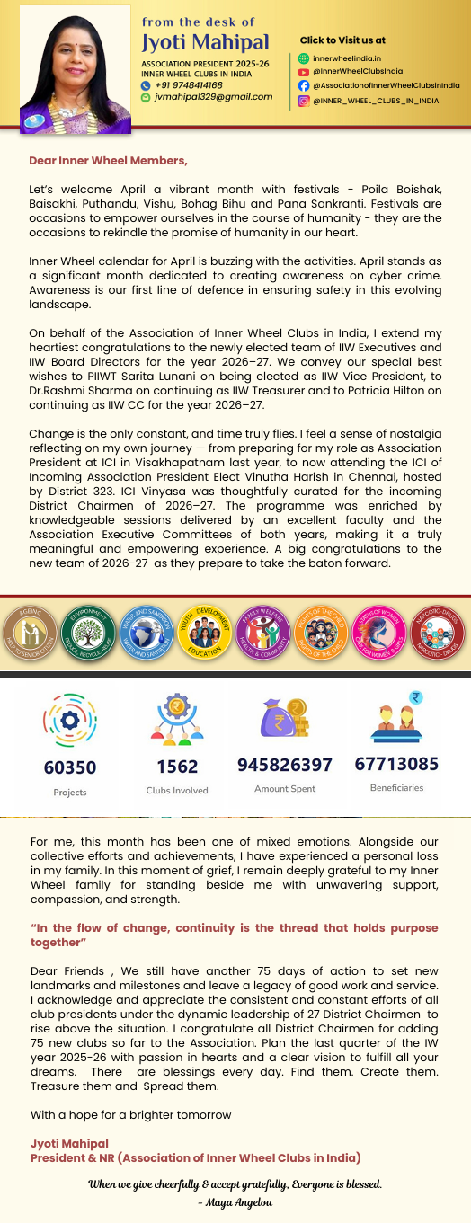 Inner Wheel calendar for April is buzzing with the activities. April stands as